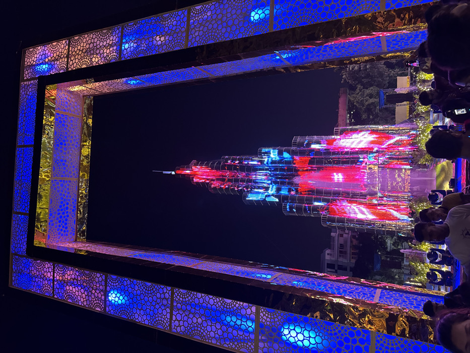 This nighttime image captures a festive outdoor scene in Bidhannagar, India. A large, illuminated rectangular archway dominates the foreground, constructed from reflective gold-colored material and panels featuring a repetitive pattern of circular perforations, emitting internal blue and purple light. Framed within this archway is a tall, multi-tiered structure designed to resemble the Burj Khalifa, brightly illuminated by dynamic red and blue projected lights that animate its reflective, stepped surfaces. At the base of this central structure, white string lights and multiple stage spotlights are visible. The lower third of the image is occupied by a dense crowd of people, mostly seen from behind or partial profiles, observing the illuminated displays. No distinct actions or interactions are discernible among the individuals in the crowd. The sky is dark and clear.