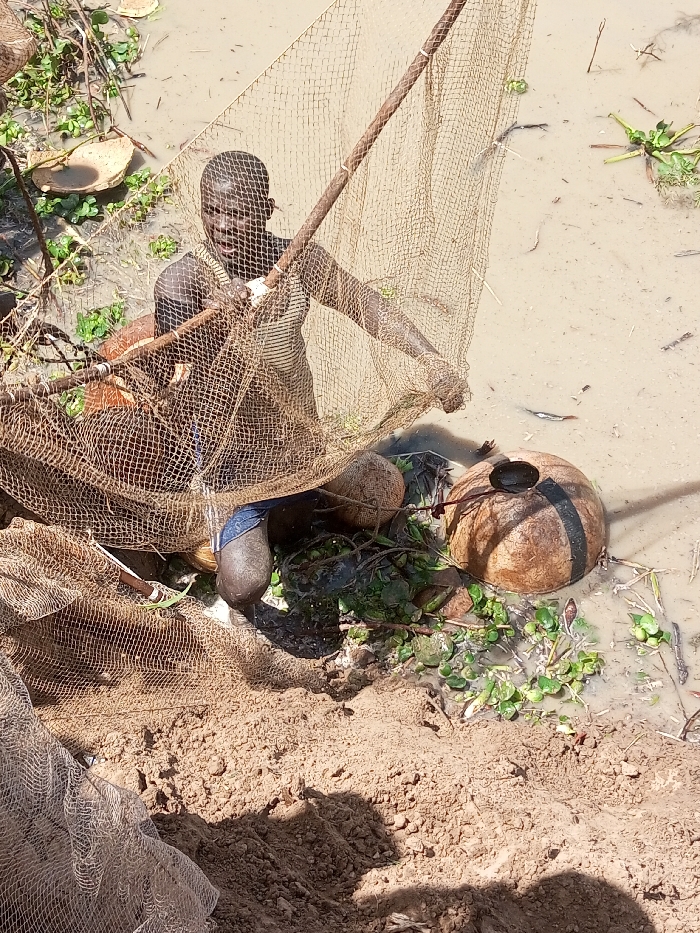 An adult male is observed in a shallow, turbid body of water at the edge of a sandy bank in Kokani North, Nigeria. He has dark skin, short dark hair, and is wearing a light-colored, possibly striped, sleeveless top and dark blue shorts. The man is actively engaged in fishing, holding and manipulating a large, coarse-mesh fishing net attached to a long wooden pole. Several small, silver fish are visible in the muddy water near the net. To his right, two large, spherical, brown objects, consistent with gourds or buoys, float in the water; one displays a dark band and a dark scoop partially submerged in an opening. Green aquatic vegetation is scattered throughout the water and along the bank. The immediate foreground consists of disturbed light brown sandy soil, illuminated by bright daylight, casting visible shadows.
