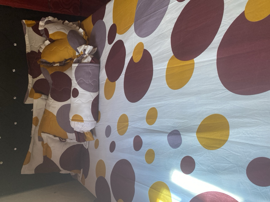 The image displays a neatly made bed in a bedroom, located in the city of Mape, Nigeria. The bed is covered with a white sheet featuring a random pattern of large, irregularly shaped circular or oval dots in maroon/burgundy, golden yellow, and light purple/mauve. Resting against a black, upholstered headboard adorned with small, reflective, possibly crystal-like embellishments, are multiple pillows. These include two standard pillows matching the patterned sheet, two smaller decorative pillows (one solid golden yellow with a ruffled edge and quilted texture, and another patterned with a ruffled edge), and one centrally placed bolster pillow, also matching the patterned sheet and featuring quilted sections with ruffled ends. A section of dark red fabric, possibly a curtain, is partially visible on the far right side of the frame. A distinct shaft of natural light illuminates the lower-left portion of the bedspread. No individuals, actions, or interactions are depicted in the scene.