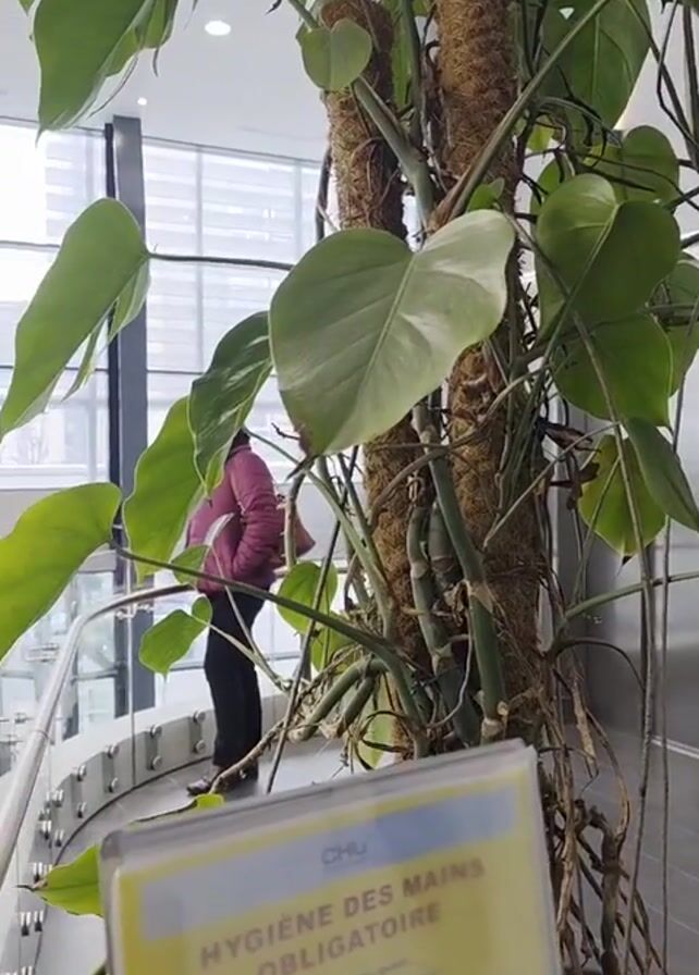The camera focuses on a large potted plant with broad, green leaves and a brown-wrapped supporting structure. In the background, a woman in a pink jacket stands by a curved railing, looking out towards a windowed entrance. A sign in the foreground reads "HYGIENE DES MAINS OBLIGATOIRE". Through the windows, vehicles and a person walking towards the building entrance are visible. The interior is modern, with a shiny tiled floor, black vertical beams and an abundance of natural light. The camera moves up, revealing more of the entrance with glass doors and signage above the doors. Another person is visible walking towards the building.