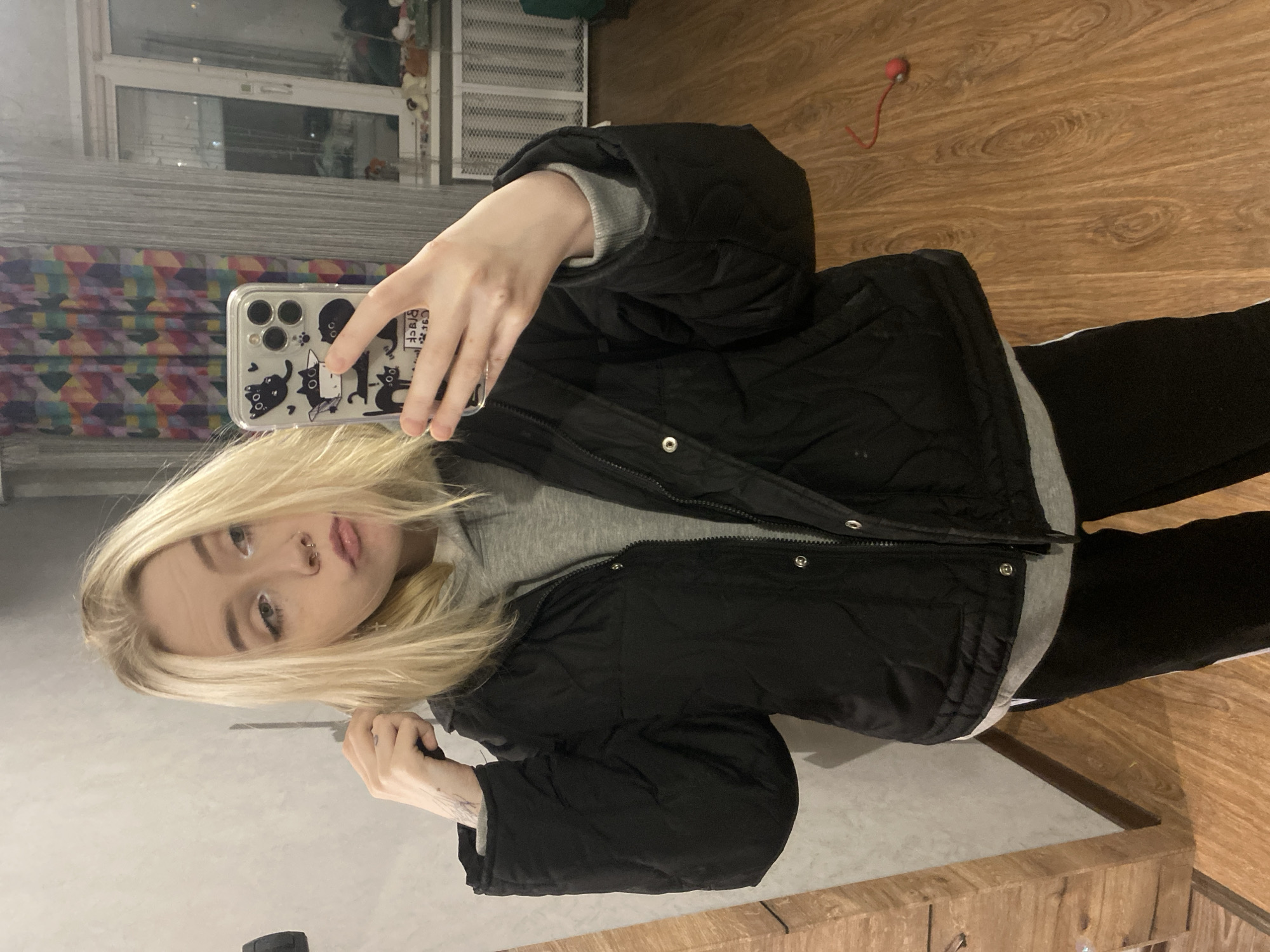 A young female is depicted in a mirror selfie taken within an indoor residential setting in Izhevsk, Russia. She has shoulder-length blonde hair, a nostril piercing, and a septum piercing, and her lips are slightly puckered. She wears a black quilted puffer jacket over a grey hooded sweatshirt and black pants with a white stripe along the side. Her left hand is positioned near her head, touching her hair, while her right hand holds an iPhone with a clear, black cat-themed case, pointed towards the mirror to capture her reflection. The mirrored background reveals a light-colored wall, multicolored geometric patterned curtains, a window displaying a dark exterior, a white radiator, and a light brown wood-grain floor. A small red object is visible on the floor to the right.