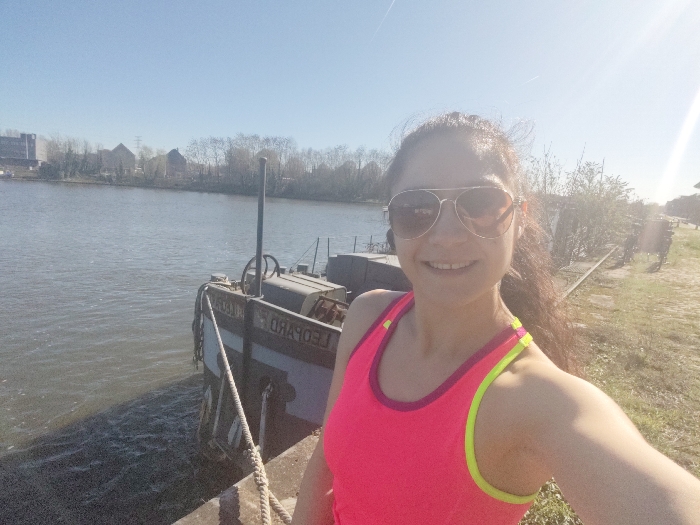 A young woman is captured in a selfie-style photograph, smiling directly at the camera. She wears dark aviator sunglasses and a bright pink athletic tank top with neon yellow-green trim on the straps. Her dark, curly hair is pulled back. The scene is set outdoors on a sunny day with a clear blue sky, indicated by the strong sunlight and a prominent lens flare originating from the upper right quadrant. To the left of the woman, a dark-colored utility barge, named "LEOPARD" (visible in reverse text on the stern due to selfie mirroring), is moored to a concrete quay with a thick rope. The barge sits in a wide body of water, likely a river or canal, which dominates the midground. The water shows ripples from mild current or disturbance. Across the waterway, the opposite bank features a treeline with mostly bare deciduous trees, suggesting late winter or early spring. Beyond the trees, various buildings, including what appears to be an industrial structure and residential-style houses, are visible. A power line tower stands in the distant background. To the right of the woman, a grassy, unpaved bank or path runs alongside the water. Sparse, overgrown vegetation lines this path. The overall environment suggests an urban-industrial waterfront area in Ghent, Belgium, specifically along one of its prominent waterways such as the Scheldt or Leie River.