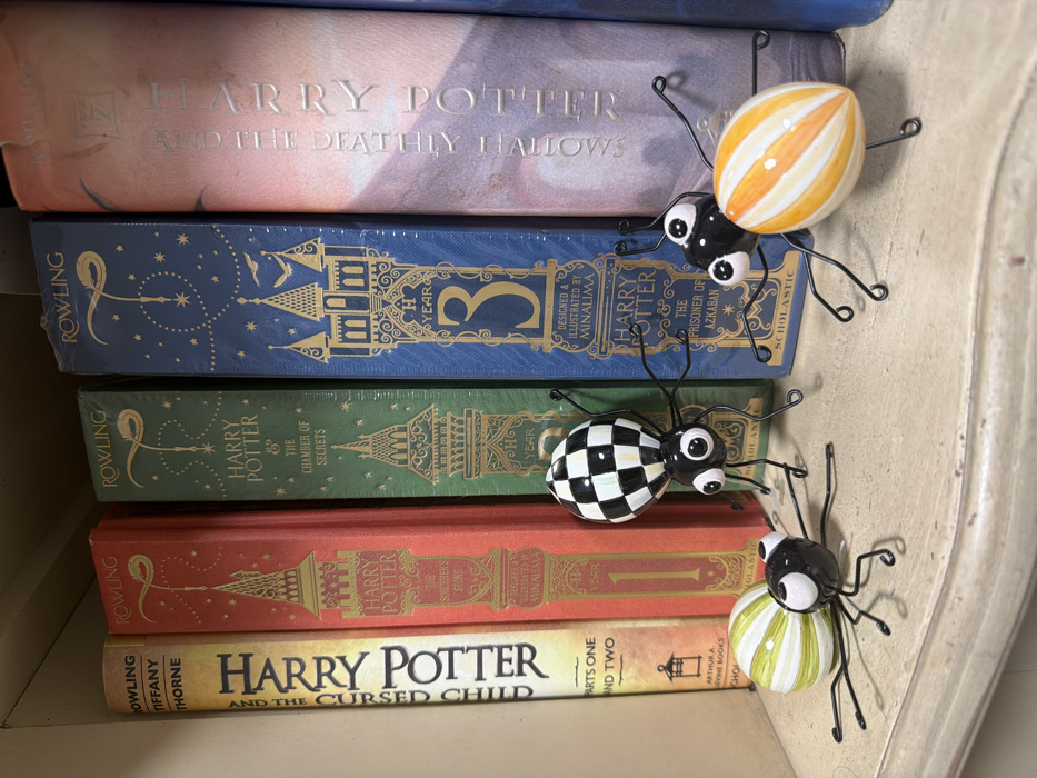 A stack of five Harry Potter books is arranged in a shelf. From top to bottom, the book spines show "Harry Potter and the Deathly Hallows," "Harry Potter and the Prisoner of Azkaban," "Harry Potter and the Chamber of Secrets," "Harry Potter and the Sorcerer's Stone," and "Harry Potter and the Cursed Child." Three decorative spider figures with different patterns adorn the books. The spider patterns are orange stripes, checkerboard, and green stripes. The shelf is made of light wood.