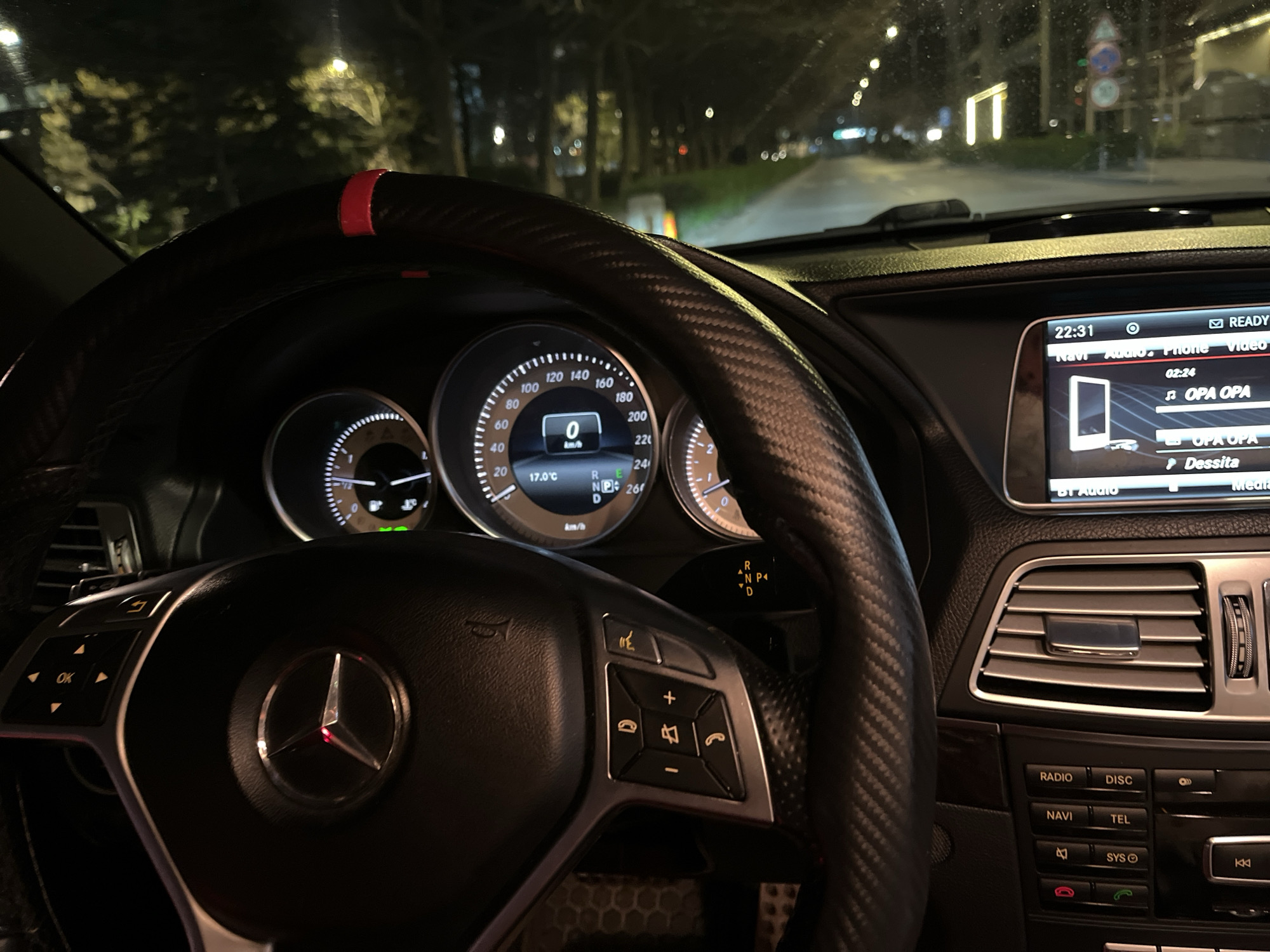 interior of a Mercedes-Benz car, likely a W212 E-Class model, focusing on the driver's seat. The steering wheel has a carbon fiber finish with a red accent at the top. The instrument cluster shows the car is stationary (0 km/h). The infotainment screen displays a time of 22:31 and the song "OPA OPA" playing. The dashboard features buttons for radio, disc, navigation, telephone, and system functions. The view through the windshield reveals a road at night, lined with trees and streetlights, suggesting an urban or suburban environment. A traffic sign is visible on the right. Based on image analysis, the location is Sofia, Bulgaria. The car is either parked or stopped in traffic.