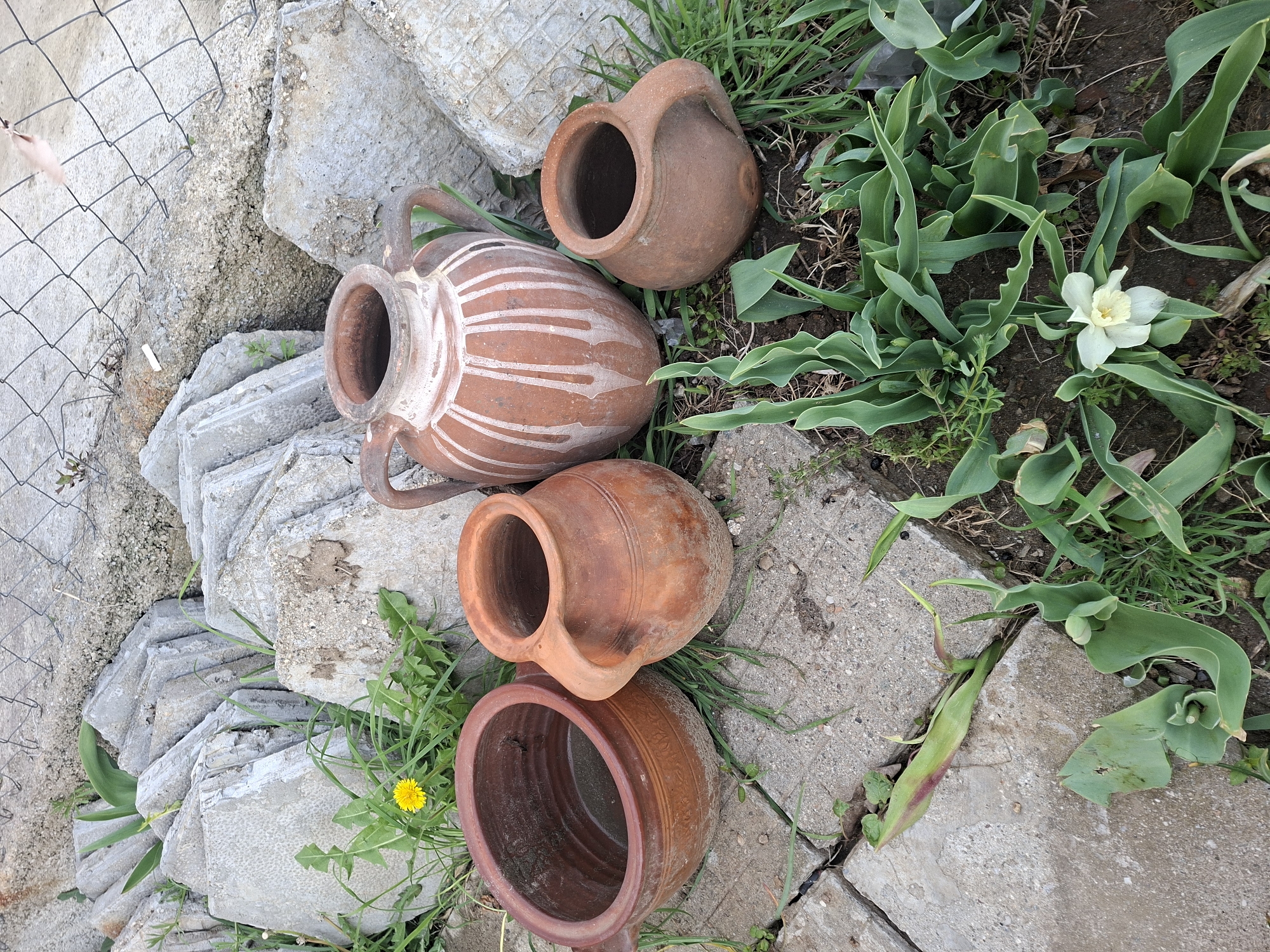 - "The image, likely taken in Selishte, Bulgaria, shows a collection of four terracotta pots of varying sizes and designs arranged on a cracked concrete surface intermingled with vegetation" by FM-iKbEw2, licensed under CC BY 4.0