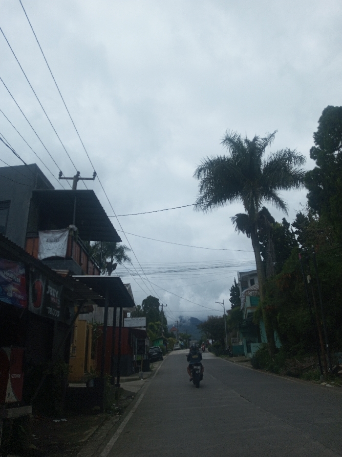 The image displays an overcast daytime street scene in Sarwahi Mal., India. A dark asphalt road extends into the distance, where mountains are partially obscured by mist and low clouds. On the left side of the road, a row of multi-story buildings features ground-level commercial spaces with corrugated metal awnings. The nearest building exhibits a white banner with "Annisa SALON" visible on its upper balcony, and a lower sign advertising "JAY TELO" with a price of "18.000." A network of overhead electrical wires and utility poles spans above these structures. On the right side of the road, a tall palm tree with broad, spiky fronds stands prominently, accompanied by dense green foliage and additional buildings further along the street. A single individual, wearing a dark jacket and a dark helmet with a reflective pattern on the back, is riding a black motorcycle away from the viewer, proceeding down the center of the road. No other significant pedestrian or vehicular traffic is immediately visible.