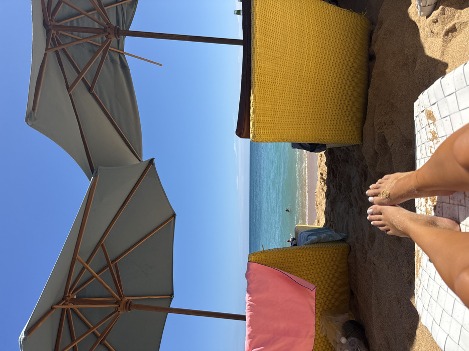 This image presents a first-person perspective of a beach scene at Rumassala, Sri Lanka. In the immediate foreground, a pair of bare, tanned human feet with white-painted toenails are visible, resting on a white, grid-patterned surface. Some sand adheres to the right foot. Directly beyond, two yellow, woven beach chairs or loungers frame the central view towards the ocean. The left chair has a pink towel draped over its back and a plastic bottle positioned near its base. The right chair contains a dark object near its base and additional items on its armrest. Between the chairs, a sandy expanse extends to the water's edge. In the midground, the turquoise-blue ocean is visible with gentle waves breaking on the shore. Two individuals are discernible in the ocean, one further out and another closer to the shoreline. The background is dominated by a clear, cloudless, vibrant blue sky meeting the ocean at a defined horizon. Overhead, partially obscuring the sky, two open grey beach umbrellas with visible wooden structural frames provide shade.