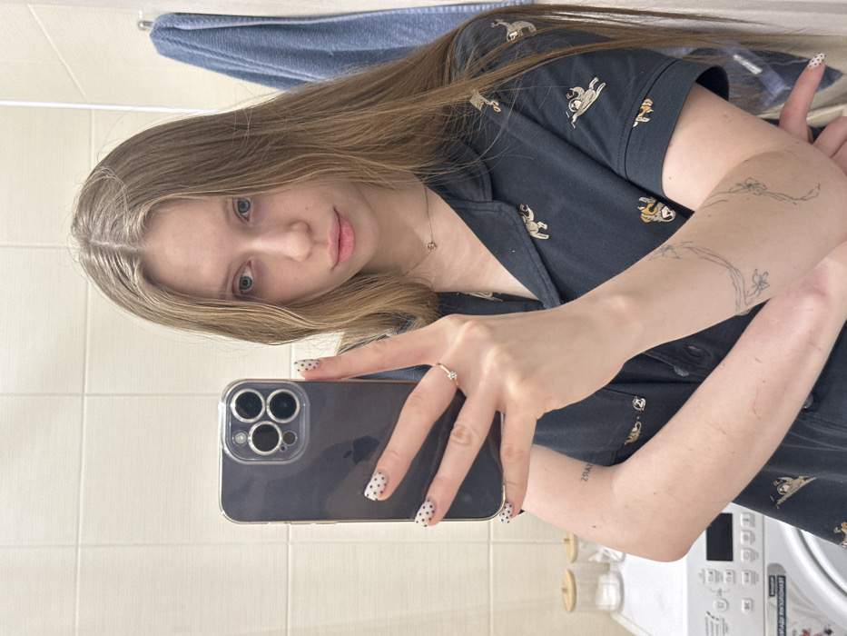 A young woman with long, straight, blonde hair takes a selfie in a bathroom setting. She holds a phone with a multi-lens camera, displaying nails painted with a polka dot pattern. The woman wears a dark-colored shirt with a whimsical sloth print and a delicate necklace. A floral-style tattoo is visible on her arm. Behind her is a tiled wall, a blue towel, and a washing machine in the background. She gazes at the camera with a subtle, gentle expression.