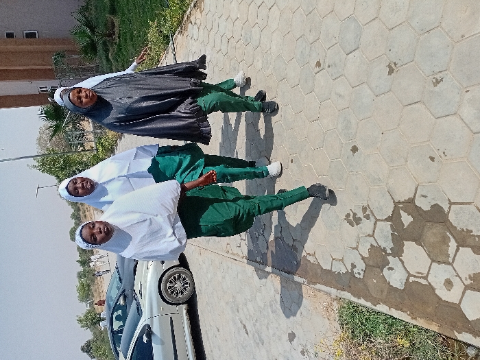 The scene is an outdoor daytime view in Kwazailewa, Nigeria. Four females are walking on a light-colored hexagonal paved path, moving from the foreground towards the mid-ground. The two leading individuals wear white hijabs, dark green long-sleeved tops, and dark green trousers. The third female, positioned slightly behind them on the right, wears a dark grey/black abaya and a matching hijab, covering dark green trousers. The fourth female, partially visible behind the third, wears a white hijab and a white top. To the immediate left of the paved path, a silver sedan is parked on a dirt area, with a darker sedan positioned behind it. Dry vegetation and bare ground border the paved path on the left, next to the parked vehicles. To the right of the paved path, manicured green landscaping and a light-colored building with multiple windows are visible. The sky is clear blue, indicating strong sunlight, which casts distinct shadows. Several wet spots are present on the paved walkway. In the distant background, additional figures and sparse vegetation are discernible.