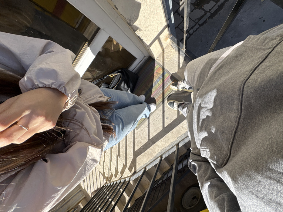 A high-angle photograph captures two individuals on an outdoor staircase or landing in Yerevan, Armenia. The perspective is from the first person, looking down at a second individual and the surrounding environment. The second individual stands on a concrete landing, wearing light blue jeans, a light beige or grey oversized jacket with elasticated cuffs, and white athletic shoes. A simple silver ring is visible on their right ring finger. Long dark hair is visible. A black handbag with gold hardware rests on the landing next to their feet, adjacent to a colorful striped doormat positioned in front of a white-framed door or window. The observer's lower body is visible in the foreground, wearing grey sweatpants and grey and white athletic shoes, standing on a dark metal platform or stair. Strong direct sunlight illuminates the scene, casting prominent, sharp shadows from the black metal railings and both figures onto the concrete surface. A dark, circular object, possibly a tire, is partially visible behind a railing in the lower left.