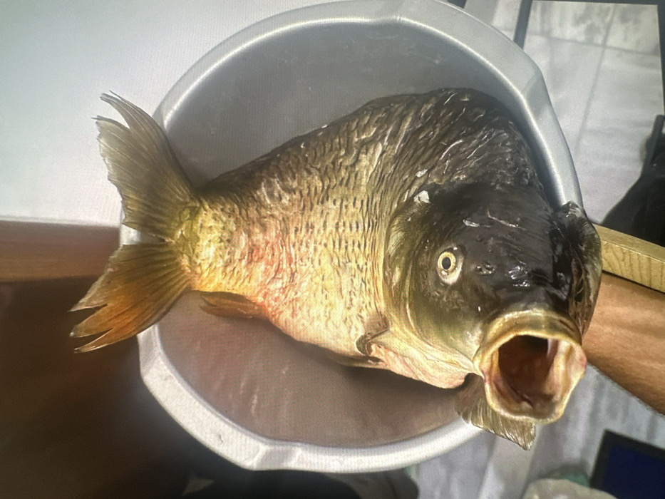 - "A large common carp, displaying olive-green and brown scales with reddish-orange coloration on its underside, is positioned vertically, head-down, within a silver-colored metal bowl" by FM-Eq6832, licensed under CC BY 4.0