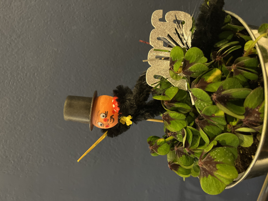 A close-up indoor photograph depicts a decorative plant arrangement, located in the city of Meisenheim, Germany. The central object is a potted Oxalis triangularis plant, characterized by numerous green trifoliate leaves, each possessing a distinct dark purple or burgundy central marking. The leaves exhibit some white speckled residue. Emerged from the plant's foliage is a small, handcrafted figurine, approximately 10 cm in height. This figure features an orange-painted spherical head with painted black eyes, thin black eyebrows, red cheeks, and a smiling red mouth revealing white teeth. It wears a black top hat and a body constructed from black fuzzy pipe cleaner-like material, designed to resemble a suit. A small yellow four-leaf clover charm is affixed to its upper chest area. The figurine holds a thin yellow stick, approximately 7 cm long, extending upwards and to its right. It is mounted on a thin wooden stick inserted into the plant's soil. To the right of the figurine, also inserted into the plant, are silver glitter-covered numerals forming "2026," positioned upright. Adjacent to these numerals, black feathery or tinsel-like decorative elements are visible, along with small hints of red and white striped material. The plant is contained within a silver-colored metallic pot or bucket, the rim of which is visible at the bottom of the frame. The background is a solid, dark grayish-blue wall, featureless.