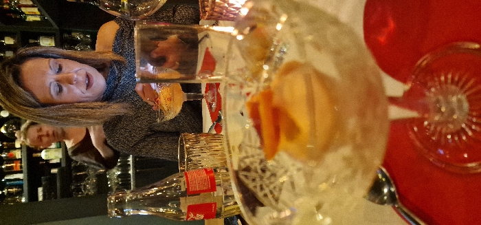 A woman with short blonde hair and a gray sweater is at a table with a drink. Another woman is in the background, near a wine rack. The table has multiple glasses and a spoon on a red tablecloth. A clear glass is filled with liquid and a slice of fruit, possibly orange. A Coca-Cola bottle is near other glasses.