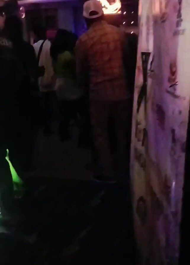 dimly lit nightclub with a mix of colorful, mostly red and green lighting. A small group of people are gathered, some standing and some moving, obscured by the low light. One person is wearing a white cap and a plaid shirt. Another person is wearing dark clothing with white stripes down the side and the word "pama" on the back. The floor is dark and shiny, reflecting the lights. A decorated column is visible on the right side of the frame. The overall atmosphere is active and social.