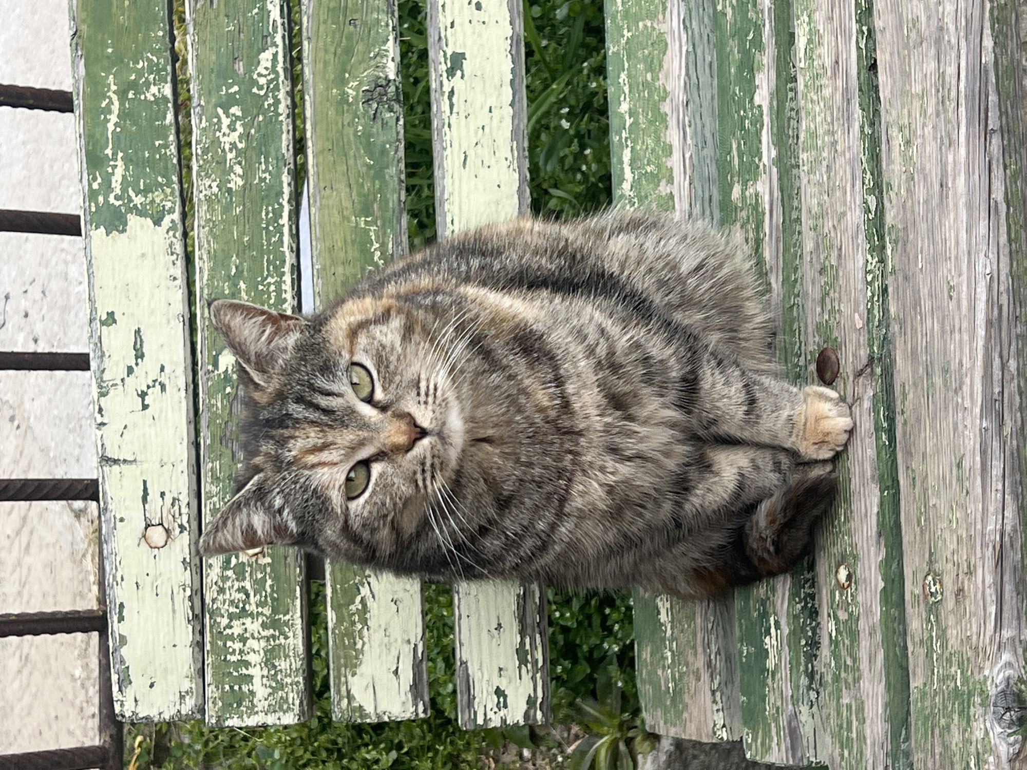 In Kornitsa, Bulgaria, a tortoiseshell tabby cat, displaying brown, grey, black, and reddish-orange fur patterns, sits centrally on an aged wooden bench. The cat faces directly forward, exhibiting green eyes and prominent white whiskers. Its front paws are tucked beneath its chest, and its tail is curled on the bench to its right. The bench consists of horizontal wooden slats painted a distressed green, with significant paint chipping and peeling revealing the lighter, weathered wood beneath. Visible metal fasteners secure the slats. Behind the bench, a dark metal fence with vertical bars is present. Green foliage and small plants are visible through and around the bench slats and behind the fence. The background beyond the fence appears to be a light-colored ground surface. No other subjects or actions are observed.