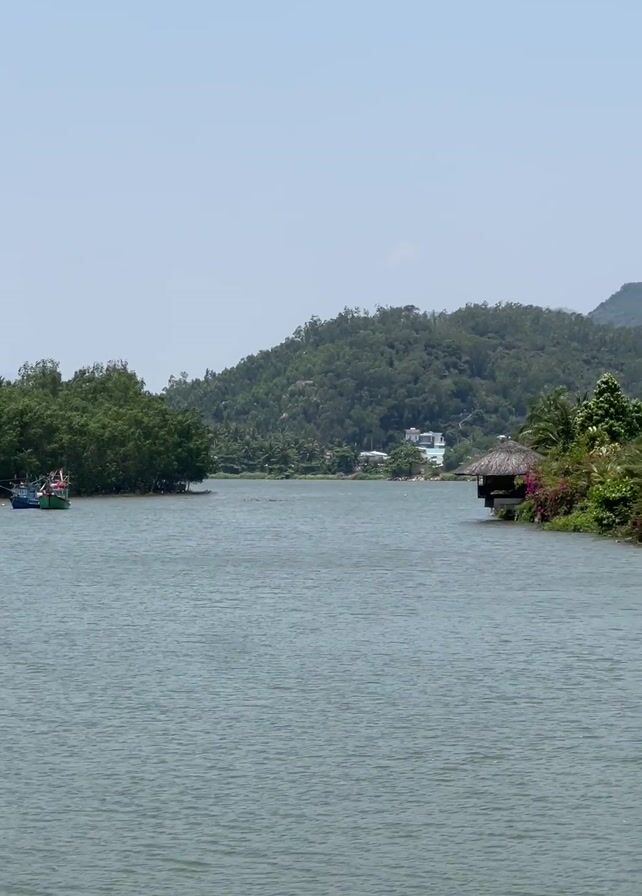 body of water with a building on one side and greenery on the other. The building is white and appears to be a hotel or apartment complex. The greenery consists of trees and other vegetation. There are some boats on the water in the distance. The sky is clear and blue.