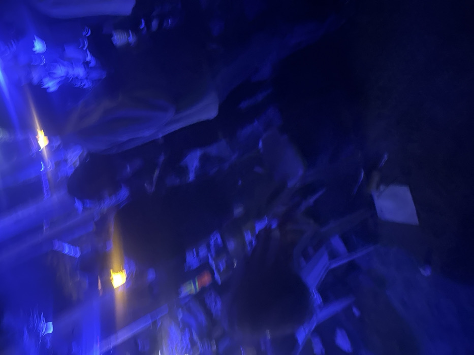 A blurry, dark image primarily features blue and black hues. Streaks of blue light illuminate sections of the scene, while the black dominates the upper and right portions. There appears to be indistinct shapes and possibly a person, but the poor focus makes it difficult to definitively identify objects or subjects. A few orange and yellow points of light are present, adding to the distorted and abstracted composition.