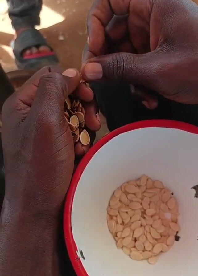 A person is shown shelling seeds with their hands. They hold a handful of dark brown seeds in one hand while the other hand separates the seed from the outer shell. The extracted seeds are dropped into a white bowl with a red rim, already partially filled with the same type of shelled seeds. The person's dark skin is visible. The seeds are beige, oval-shaped, and about the size of a fingernail. Parts of other people's clothing and footwear are visible in the background. The background is somewhat blurred, but appears to be a light-colored, possibly sandy, outdoor surface.