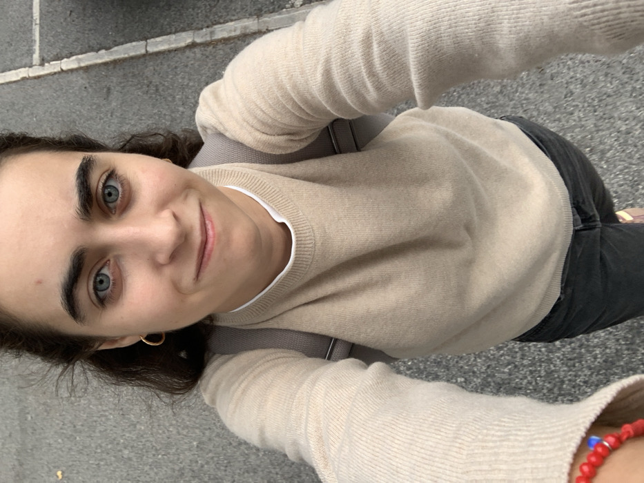 The image captures a female subject in a high-angle perspective, facing the camera with a subtle smile. The depicted location is Lisbon, Portugal, with the immediate background consisting of a plain gray asphalt surface and a lighter gray curb along the right side of the frame. The subject has dark, wavy hair, blue eyes, and light skin. She is dressed in a light beige long-sleeved crew-neck sweater layered over a white top and dark gray or black jeans. A gray backpack strap is visible over her right shoulder. She wears a gold-colored hoop earring in her left ear and a red beaded bracelet on her left wrist.