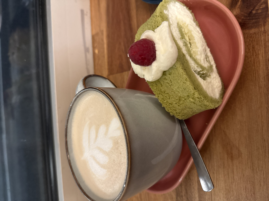 - "The image presents a close-up, slightly overhead view of a coffee drink and a dessert arranged on a wooden table or countertop" by FM-BCfsB2, licensed under CC BY 4.0