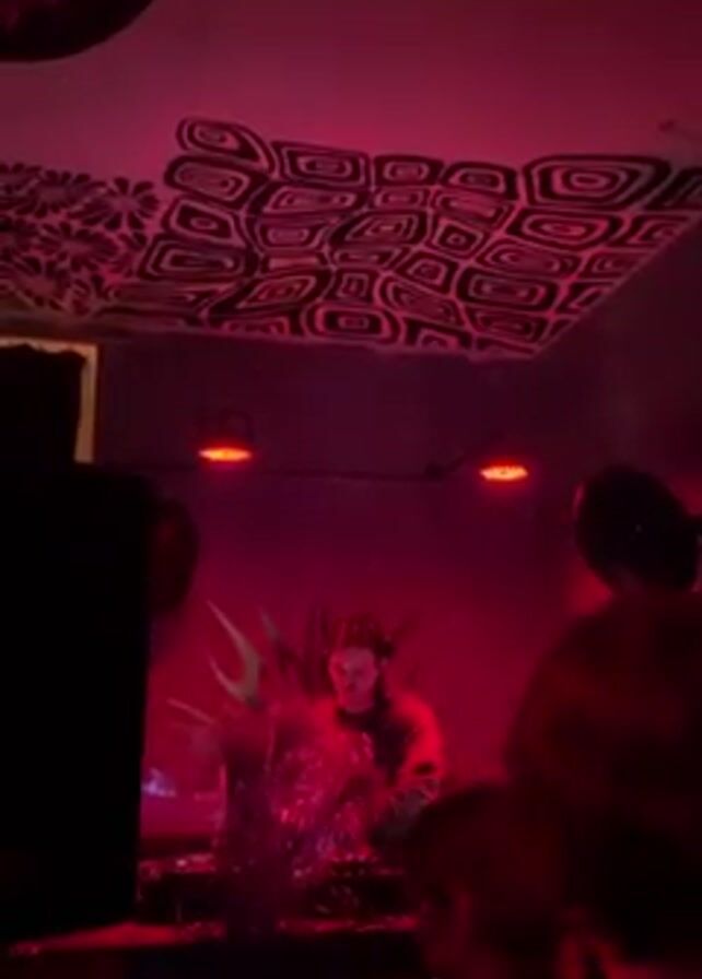 A DJ plays at a club. Red lights fill the room. The DJ is wearing headphones and fiddling with the dials of the equipment. A few people stand and watch. The ceiling is decorated with a black-and-white geometric pattern. There are speakers on the walls, and plants behind the DJ.
