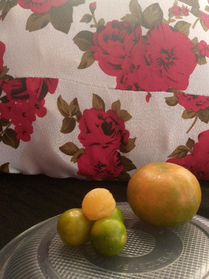 The scene, located in Sabana de Machango, Venezuela, depicts a static arrangement of fruit. In the foreground, a clear, ridged plastic surface, possibly a plate or container lid, serves as a base for several citrus fruits. To the left, a cluster of three small, green spherical fruits, resembling limes, is visible. Perched atop these limes is a single, small, spherical piece of yellow fruit, appearing peeled or naturally textured. To the right, a larger, round, greenish-orange citrus fruit, consistent with a tangerine or small orange, rests on the plastic surface. The background features a textile fabric with a repeating pattern of large red roses and dark green leaves against a light grey background. A horizontal seam or crease is visible across the mid-section of the patterned fabric.