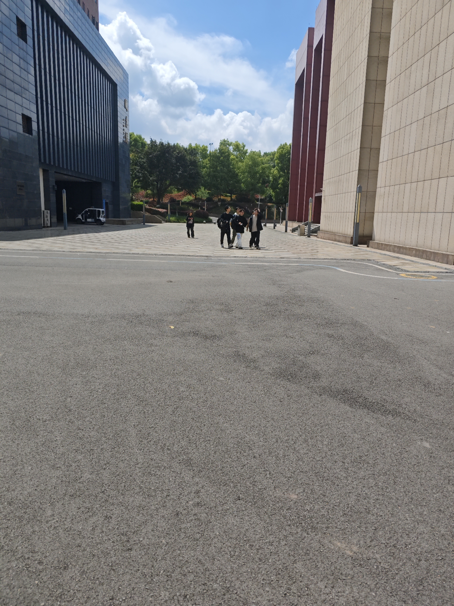 The image depicts a street scene in Chongqing High-tech Zone, China, on a day with clear blue skies and scattered clouds. The foreground is dominated by an expanse of gray asphalt roadway. In the midground, a group of approximately six people are walking together on a paved area between two large buildings. To the left, a modern building features a dark gray, vertically paneled facade with a covered driveway where a small white vehicle is parked. To the right, a light-colored building with a grid-like surface is present. Between the buildings, trees and greenery are visible.