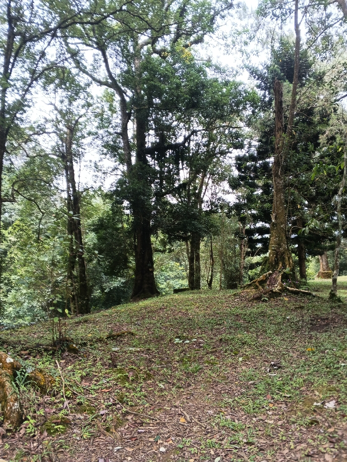 The image displays a dense, verdant forested area, consistent with natural terrain within or bordering Tây Ninh, Vietnam. The foreground presents a ground path or cleared section, sloping gently uphill towards the center. This ground is covered with a mixture of dry leaves, sparse green grass, and visible patches of dark soil and earth. On the lower left, exposed moss-covered rock and tree roots are present. The midground and background are dominated by numerous tall, mature trees, exhibiting dark, rough trunks and dense canopies of green foliage. Several tree species are identifiable, including broadleaf trees with wide crowns and coniferous trees, notably a cluster resembling pines on the right side. Large, exposed root systems anchor a prominent tree in the mid-right. Overhead, the sky is largely obscured by the tree canopy, with diffused light filtering through, indicating an overcast or heavily shaded condition. No human individuals, animals, or artificial structures are discernible within the frame.