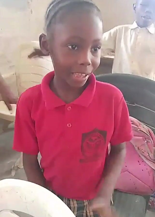 A group of young children are in a room, possibly a classroom. Most are wearing school uniforms. One girl in a red shirt and plaid skirt stands in the foreground, looking at the camera. A boy in a white shirt and tie is behind her, standing and waving his arm. There are several plastic chairs in the room, and some of the children are sitting. There is a window in the background. The atmosphere seems cheerful.