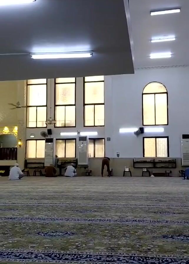 interior of a mosque. Several people are present, some kneeling and praying on the patterned carpet. Others are walking around, some wearing traditional white robes. The mosque is well-lit with a high ceiling and several fluorescent lights. There are large windows and air conditioning units along the walls. In the background, there is a decorative wall with an arched entrance and a chandelier.