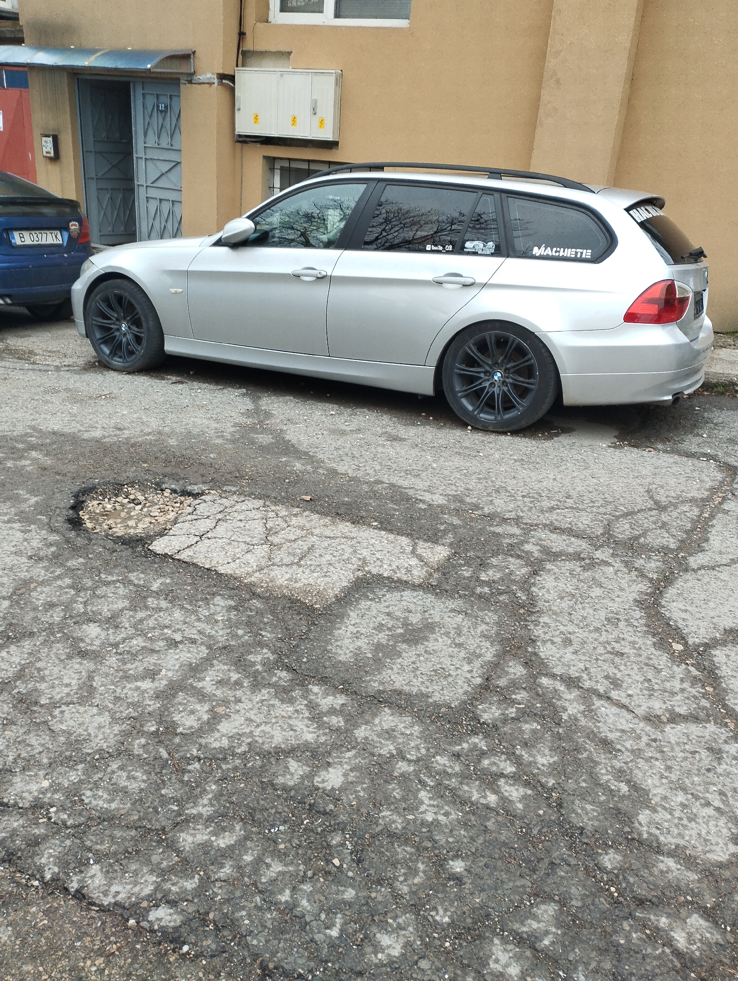 A silver BMW E91 station wagon, equipped with dark multi-spoke wheels and black roof rails, is parked on a severely deteriorated asphalt surface. The pavement displays extensive spiderweb cracking, loose aggregate, and a prominent central pothole containing standing water and debris. The BMW's rear passenger window features "MACHETTE" and "@thxito_03" decals, while the tailgate also bears a "MACHETTE" decal. Partially visible in front of the BMW is the rear section of a blue vehicle with a license plate displaying "B 0377 TK". In the background, a light-brown building presents a partially open gray metal gate, numbered "32", located beneath a blue corrugated awning. To the right of the gate, a white utility panel with three separate compartments, each marked with a yellow lightning bolt symbol, is affixed to the building's facade. No individuals are visible. The scene is located in the city of Unknown, Unknown.
