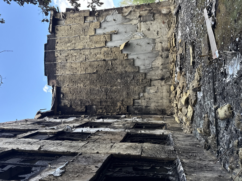 The image displays a severely damaged multi-story building located in Sumy, Ukraine. The structure's exterior surfaces are heavily charred and blackened, indicative of extensive fire damage. The left-facing facade features multiple window openings where glass panes are absent and frames appear warped or destroyed. The adjoining wall (right side of the image) exhibits significant degradation, with large sections of its external cladding missing, exposing underlying layers of damaged, fibrous insulation material and a wrinkled, grey vapor barrier. This wall also shows numerous small perforations, consistent with shrapnel or impact damage. Debris, consisting of charred building materials, insulation fragments, and other rubble, covers the ground directly adjacent to the building. The roof structure shows signs of collapse or significant damage. A clear blue sky is visible above the damaged edifice, with limited foliage in the upper right. No individuals, actions, or interactions are visible.