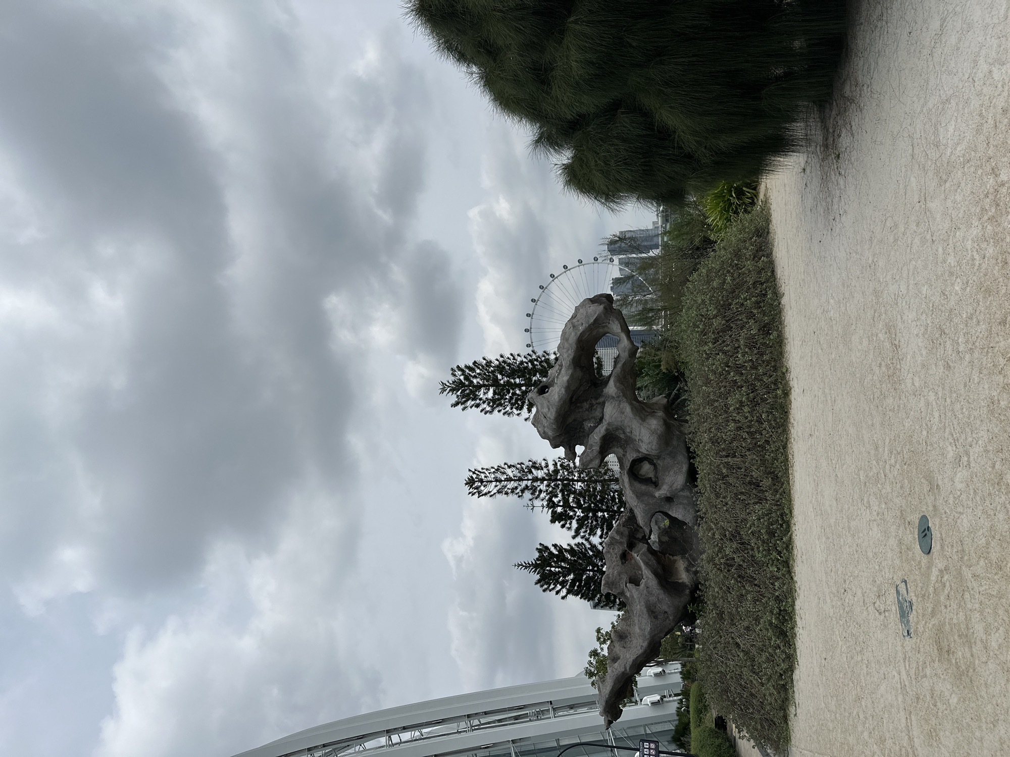 The image depicts an outdoor scene within Gardens by the Bay, Singapore, under a heavily overcast sky. A light-colored, sandy pathway occupies the immediate foreground. Centrally, a large, weathered, dark brown, abstractly shaped wooden sculpture or root formation with multiple hollows is situated on a low mound of green shrubs. To the left, a prominent section of a modern, white, curvilinear architectural structure, consistent with a conservatory dome, rises vertically, displaying numerous vertical panels and support beams. A small informational sign with white icons and text on a dark background is partially visible near the base of this structure. Several tall, slender evergreen trees are positioned behind the central wooden object. In the distant background, the upper portion of the Singapore Flyer Ferris wheel is visible, along with multiple high-rise buildings forming a city skyline. A large, dense, dark green bush occupies the far right of the frame. No individuals are clearly discernible.