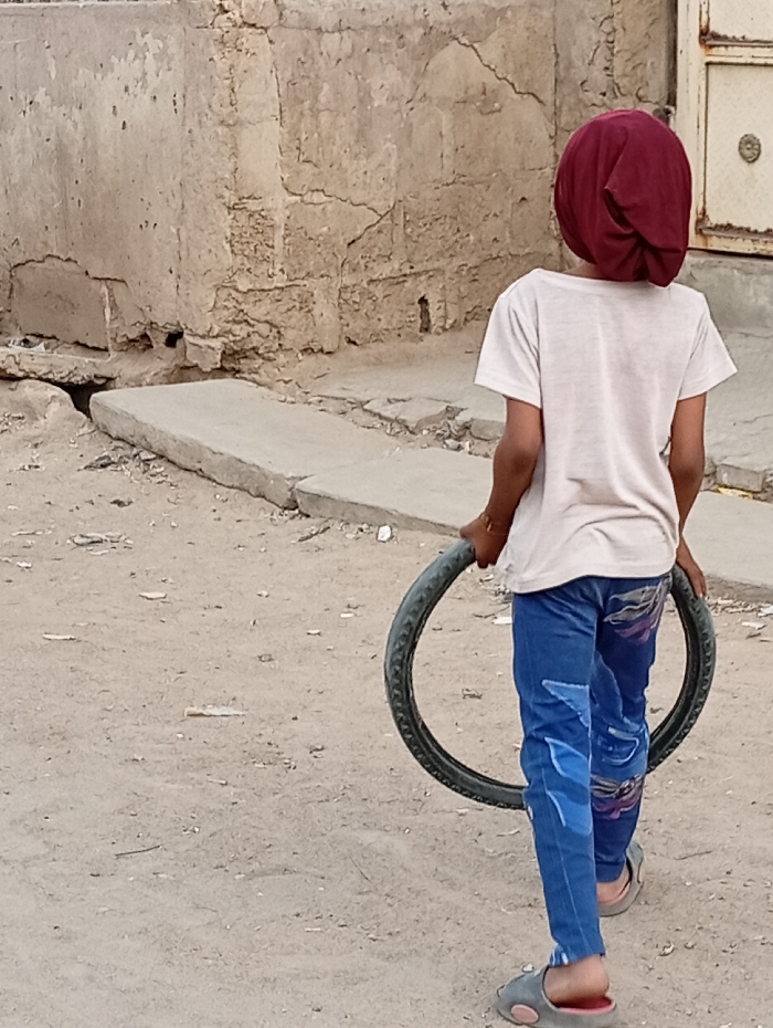 - "A young individual, seen from behind, walks on a dirt ground surface in Gwagwarwa, Nigeria" by FM-asM423, licensed under CC BY 4.0