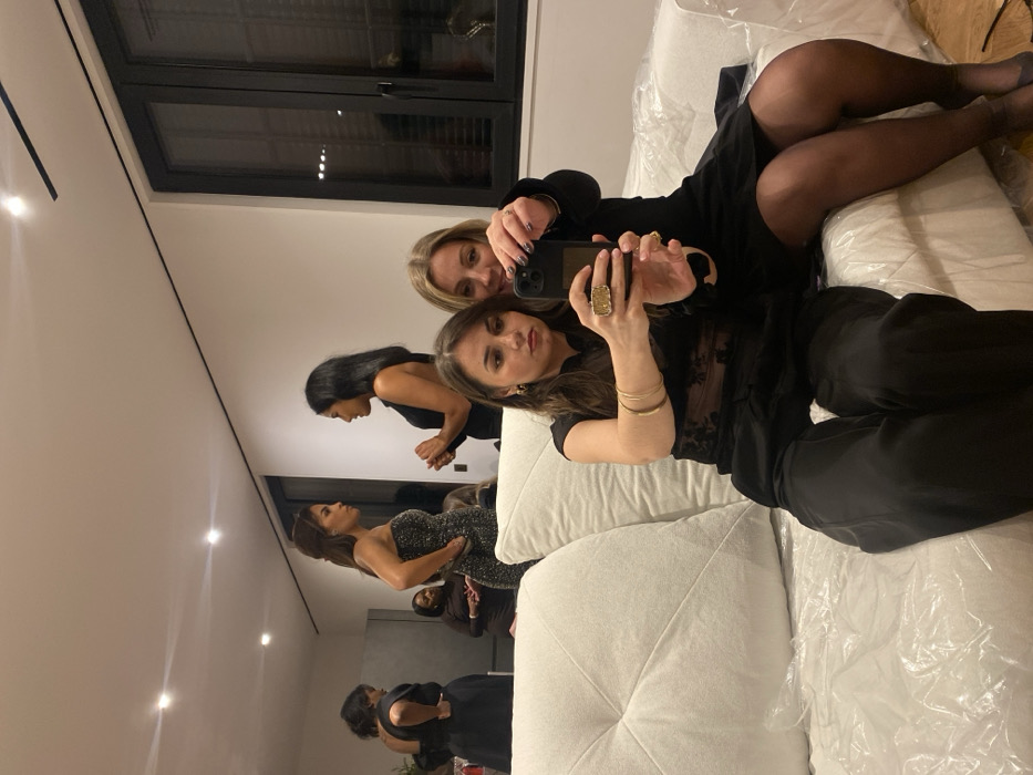 Two women pose for a selfie on a white couch covered in plastic. The woman in the foreground holds the phone, wearing a sheer black top and black pants. Behind her, a woman with blonde hair leans in. The reflection in the mirror shows several other women dressed up, one in a sparkly dress, and another in a black dress. A dark window and part of a wall can also be seen in the mirror. The setting appears to be a modern apartment.