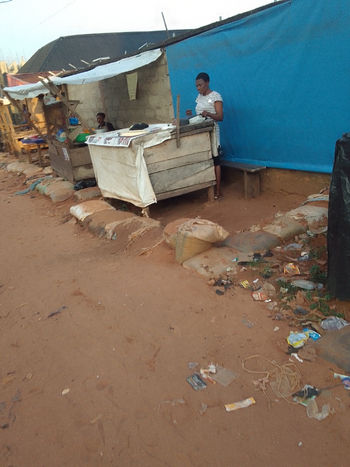 An outdoor scene in Nkpor, Nigeria, depicts a roadside market or series of informal stalls on a reddish-brown dirt ground. In the foreground, a female individual with short dark hair, wearing a white and black striped short-sleeve shirt and dark bottoms, stands behind a rustic wooden stall. She appears to be arranging or inspecting items on the stall's surface, which includes a black object and printed material, partially covered by a white cloth awning. Behind her, against a concrete block wall section draped with a large blue tarp, a small wooden bench is visible. Further to the left, a second, more obscured wooden stall is present, with another individual, possibly male, seated behind it. This stall features a light-colored awning and various items, including a green bowl. The structures behind the stalls include corrugated metal roofing and additional white fabric awnings. Along the base of the stalls and extending into the foreground, a line of soiled, burlap-like sacks filled with material forms a low barrier. The immediate ground area, particularly near the blue tarp, is heavily littered with various discarded items, including plastic wrappers, bottles, and general refuse, amidst sparse green vegetation. The sky is a light, overcast gray. The overall environment suggests an active, informal commercial area with visible signs of human activity and waste accumulation.