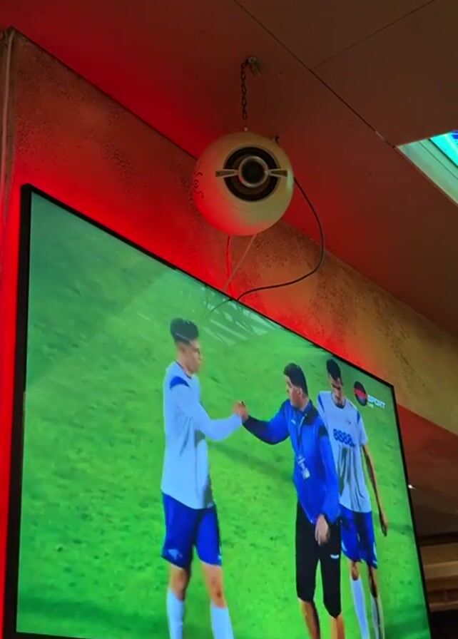 large screen displaying a soccer game, with three men visible. One is wearing a blue jacket and two are in white and blue uniforms. They are on a green field. The man in the blue jacket appears to be interacting with one of the players in uniform, possibly giving him a high-five or shaking his hand. Above the screen, a spherical white speaker hangs from the ceiling. Red ambient lighting surrounds the screen. The video is taken from a low angle, looking upwards.