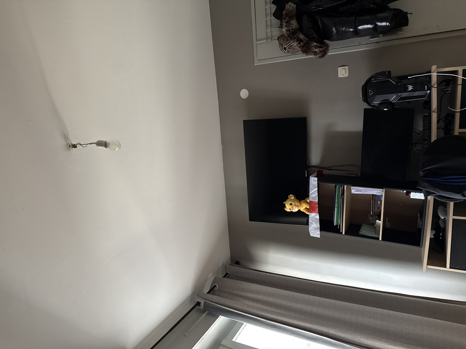 The image displays an interior residential room in Schiltigheim, France. A white ceiling features a single bare light bulb suspended by a wire. The walls are painted a uniform light gray. On the left, a window is partially visible, covered by a drawn light gray curtain. A black, open-shelf bookcase stands in the left-center, topped with a white covering and a yellow plush toy resembling Simba. Directly above the bookcase, a large, black flat-screen television is mounted on the wall. Below this, a light-colored wooden media console or desk supports a smaller black monitor and a black gaming PC tower with attached headphones. Cables connect these electronic devices. A black backpack with blue straps is draped over an object on the lower left of the console. On the far right, a light-colored door is visible, with a square white wall fixture positioned on the wall to its left. Above this, a wall-mounted rack holds a black puffy winter jacket with a fur-lined hood and a striped hat. A small white circular object is affixed to the wall above the large television.
