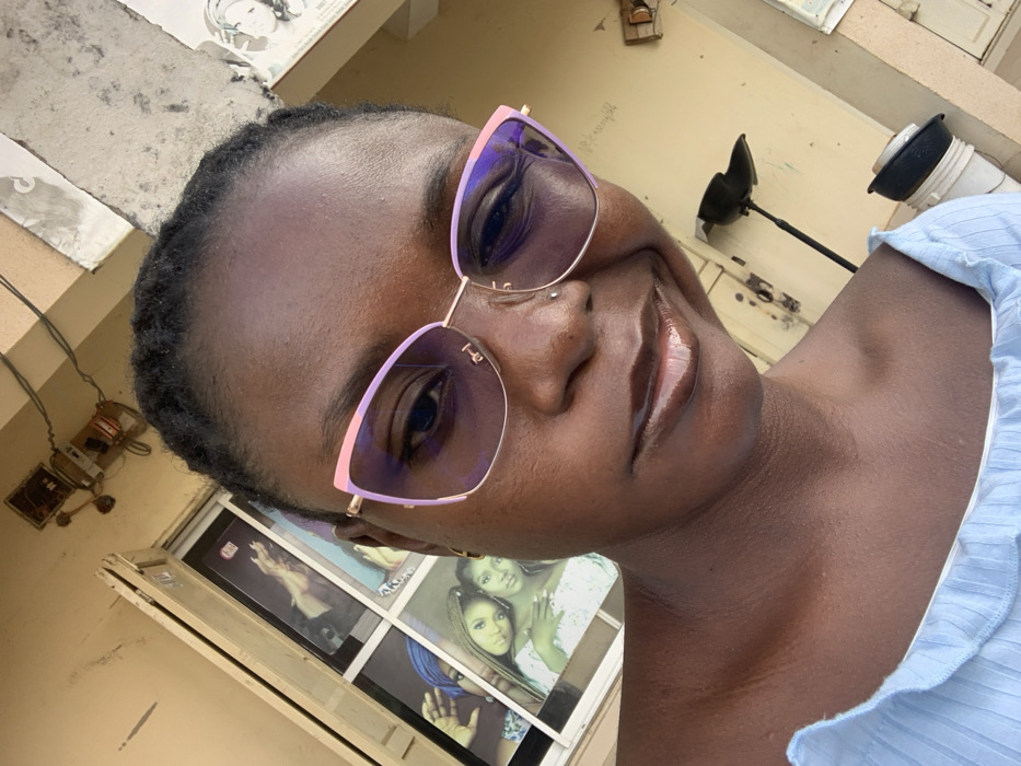 A woman smiles at the camera, wearing pink-framed sunglasses and a light blue ruffled top. She has dark skin and a nose piercing. Behind her is a cream-colored wall, and to her left, a shop window displays several portrait photographs. A black object and a white pipe fixture are visible on the wall above her. Electrical equipment and wiring hang to the left, partially obscured.