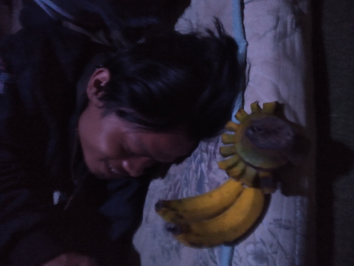 The scene is an indoor setting in Ciherang, Indonesia, dimly lit. One individual is observed lying on a light-colored, patterned mattress or blanket, positioned with their head towards the right side of the frame. The individual has dark hair and appears to be asleep or unconscious, with eyes closed or partially closed and mouth slightly agape. Dark fabric, possibly clothing, is visible around their upper body. Adjacent to the individual's head, on the same surface, are two yellow bananas, still connected at their stem. To the right of these bananas, a separate banana stem or a section of a banana peel is arranged in a radial, flower-like pattern, exposing a dark central core. No direct interaction between the individual and the bananas or stem is visible.