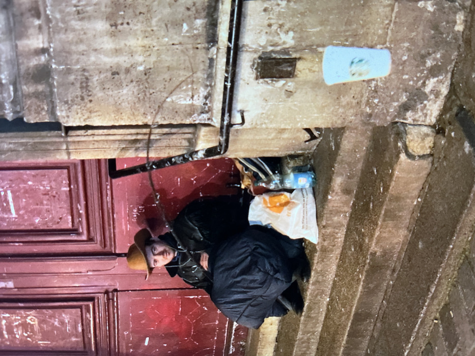 A person wearing a hat and black jacket is sitting or crouching beside a red door. Nearby is a white bag with orange printing. Above, there are stone steps or ledges with a drain pipe. A discarded wrapper or label is affixed to the stone above the person. The image is rotated clockwise by 90 degrees.