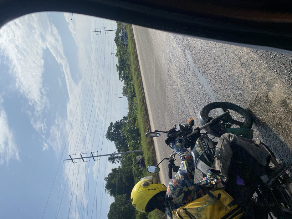 The image displays an outdoor street scene in Ikota, Nigeria, under a bright, partly cloudy sky. In the foreground and midground, a person is positioned on a black and silver Q Link motorcycle, oriented towards the right of the frame. The individual wears a bright yellow full-face helmet with a clear visor, a long-sleeved floral-patterned shirt, and dark trousers. A large, bright yellow backpack, bearing "GO" branding (likely "Gokada"), is worn on their back. The motorcycle has two rearview mirrors and features "NIKE" branding on its fuel tank. A green cylindrical object hangs from the left side of the motorcycle. The asphalt road surface in the lower half of the frame shows damp or reflective patches. Adjacent to the road, dense green tropical vegetation, including palm trees, lines the shoulder. Multiple utility poles and numerous overhead power lines are visible, extending horizontally across the upper portion of the scene. In the distant background on the right, a white vehicle, possibly a bus or truck, is partially visible. The photograph is captured from within another vehicle, evidenced by the dark, curved interior frame partially obscuring the right side of the image.