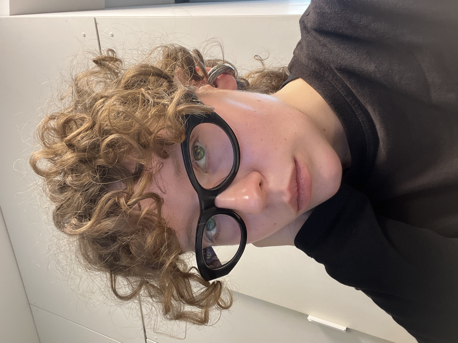 A person with curly blonde hair wears black-rimmed glasses and rests their head in their hand, which is covered by a black long-sleeved shirt. They have fair skin and green eyes. Three silver rings are on their ear. The background appears to be a plain white surface, possibly a wall or table. The image is rotated counterclockwise.