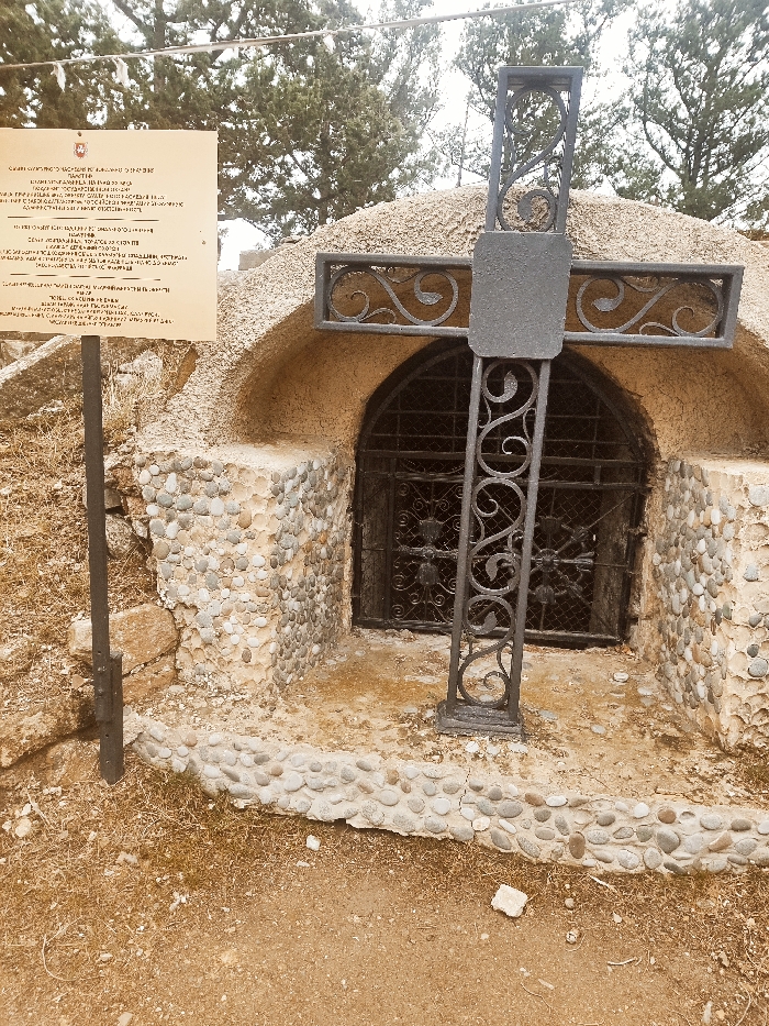 The scene depicts a small, historic-looking structure located in Utios, Ukraine. A prominent, dark metal cross with ornate scrollwork stands directly in front of an arched entryway. The structure itself is beehive-shaped, with its upper portion covered in a rough, light-brown textured material resembling stucco or earth. The base of the structure, framing the entrance, is composed of numerous rounded, light-colored pebbles embedded in mortar. The arched entryway is secured by a dark, decorative metal grate or gate featuring intricate scrollwork and a central star-like motif, obscuring the dark interior. To the left of the structure, a light-colored rectangular informational sign, mounted on a dark metal pole, displays multiple lines of text, likely in Ukrainian, and a small red and white crest in its upper left corner. The ground in the foreground consists of dry, light-brown earth with sparse patches of dried grass and scattered small stones. In the background, green coniferous trees are visible against an overcast sky. No individuals are present in the image, and no actions or interactions are depicted.