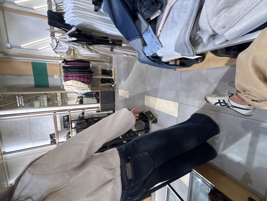 In a clothing store, a person wears dark blue jeans and a beige sweater. Other merchandise includes stacks of folded clothes, racks of shirts, and a mirror reflecting store items. Next to this person is another one wearing beige pants and white sneakers with black stripes. Their outfit suggests a casual shopping environment. The floor is tiled in grey.
