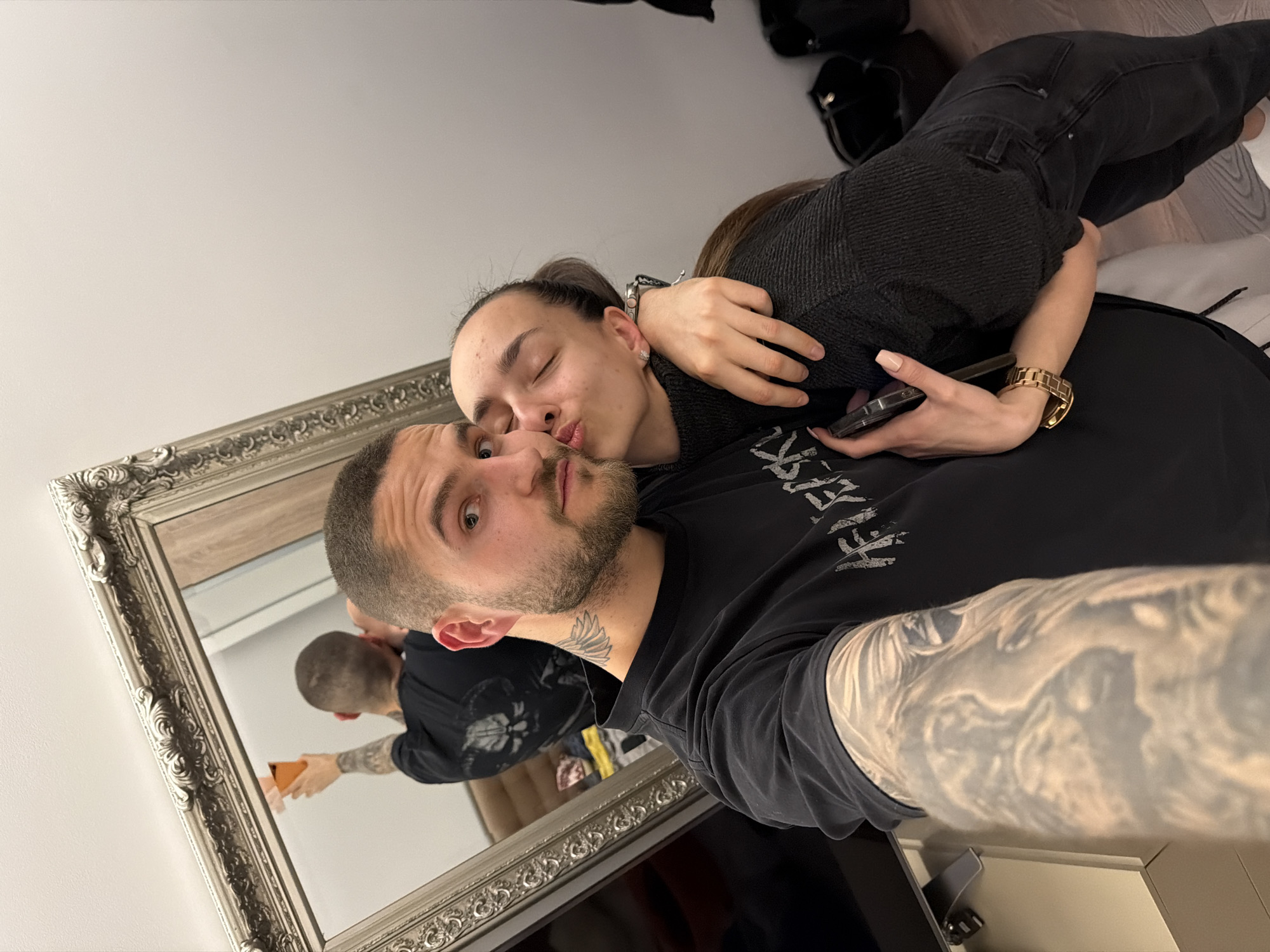 An indoor selfie, captured in Sofia, Bulgaria, features a male and female subject embracing. The male, positioned in the foreground, presents with short dark hair, a trimmed beard, a black wing tattoo on the left side of his neck, and a full sleeve tattoo covering his left arm. He wears a black t-shirt and holds a smartphone in his right hand, aimed at the viewer, indicating he is taking the photograph. His gaze is directed towards the camera. The female, positioned behind and to the right of the male, has long dark hair pulled back and wears a dark, possibly black, textured long-sleeved top and dark jeans. She embraces the male with her left arm and is shown with her eyes closed and lips pursed, making a kissing gesture towards his left cheek. Her left wrist displays a gold-toned watch, and she holds a second smartphone in her right hand. In the background, a large rectangular mirror with an ornate silver-colored frame is visible, reflecting the male's back, which reveals a light-colored skull graphic on his t-shirt. The reflection also shows his raised right arm holding an orange cup. The surrounding environment consists of plain white walls and a light-colored wooden floor, with a dark bag visible on the floor to the right.