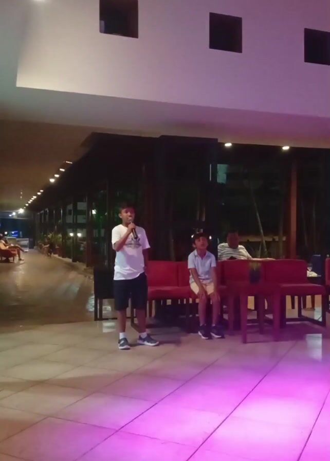 young boy singing karaoke on a patio. He is holding a microphone and standing in front of a red couch and table. A second boy is sitting on the couch, watching the boy sing. There are people sitting at a table in the background. The patio is lit with overhead lights and colored lights on the floor. The camera slowly zooms in on the singing boy.