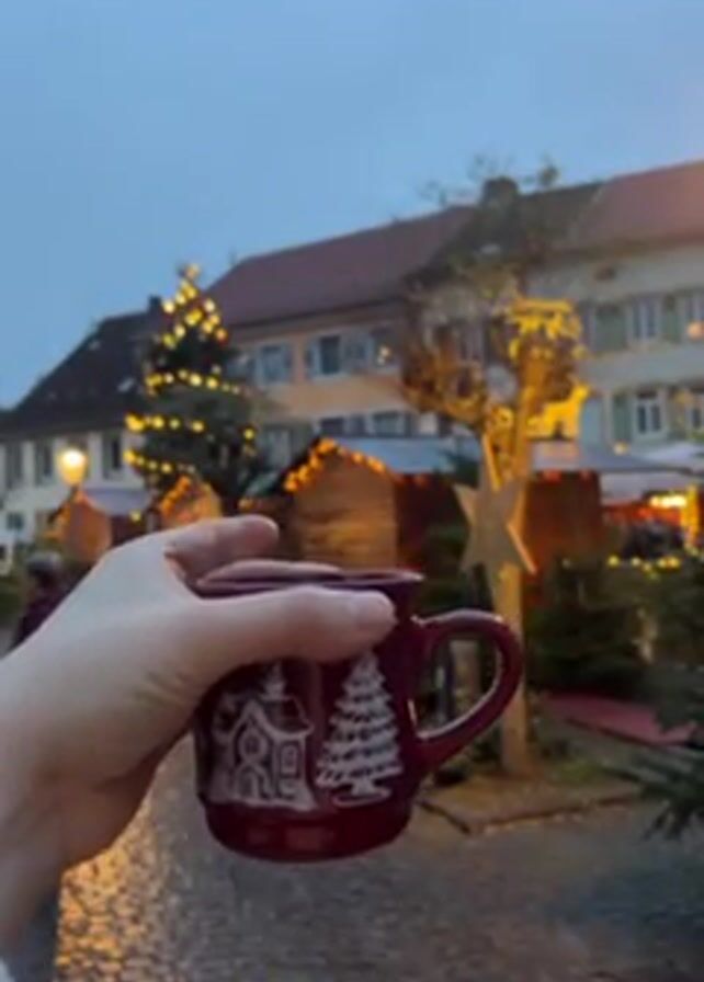 hand holding a maroon mug decorated with a Christmas tree and a house design. Steam rises from the mug, suggesting it contains a hot beverage. The background reveals a Christmas market scene with wooden stalls, a decorated Christmas tree, and buildings, all illuminated by lights in the evening. The ground is paved with cobblestones. The overall atmosphere is festive and cold.
