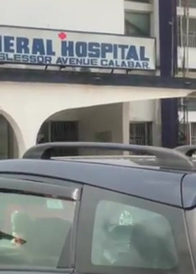 exterior of the General Hospital, Mary Slessor Avenue, Calabar. A dark blue car is parked in front of the building, partially obscuring the sign. A man in a patterned shirt walks towards the entrance of the hospital. Several other cars, including a red and silver car, are parked in front of the hospital building. People are visible near the entrance.