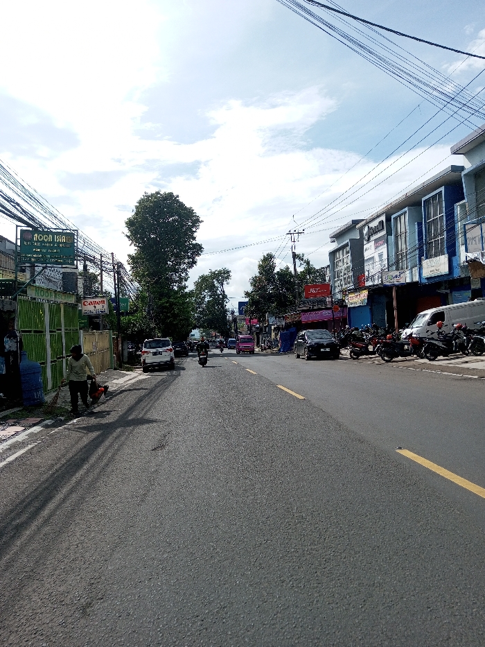 The image displays an urban street scene in Domphoog_Dungkarchhoeling, Bhutan, captured during daylight under a partly cloudy sky. A two-lane asphalt road, marked with a yellow dashed line, occupies the center, extending into the background. On the left side of the road, a paved shoulder features one individual walking away from the viewer, attired in a light-colored long-sleeved shirt and dark pants, carrying a reddish item. Adjacent to the sidewalk, a green slatted fence-like structure is visible, alongside several large blue plastic water dispenser bottles. Beyond this, commercial buildings line the street, displaying various signs, including "TOON ISIA," "NOOFT," and "Canon." Numerous overhead utility wires crisscross above this side of the street, connecting to poles. A white SUV is parked on the shoulder. In the mid-ground of the road, a black motorcycle with a rider is traveling away from the viewer. Further ahead, a white SUV, a pink car, and a black sedan are visible on the road. On the right side of the road, a wide paved shoulder accommodates multiple parked motorcycles and a white delivery van. Multi-story commercial buildings flank this side, featuring signs and advertisements such as a prominent red "J&T Express" banner, "POND'S," "L'Oréal," "Mister Donut," and "Pizza Hut." Utility poles with overhead wires are also present here. Trees are interspersed along both sides of the street. Shadows are cast across the road and left sidewalk, indicating the sun's position from the left. A white zebra crossing is faintly visible on the right side of the road further in the distance.
